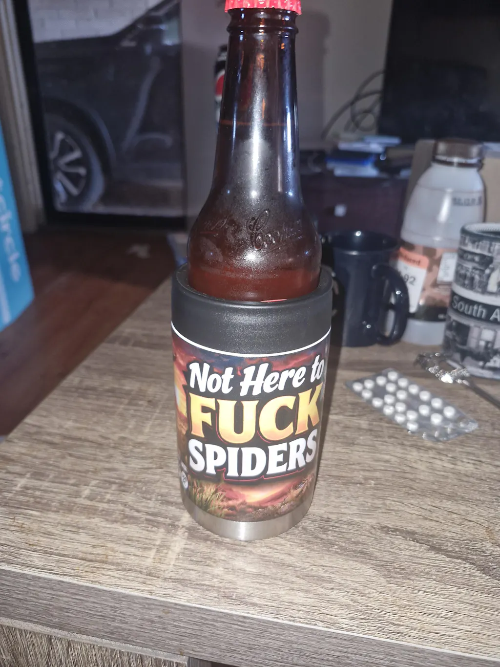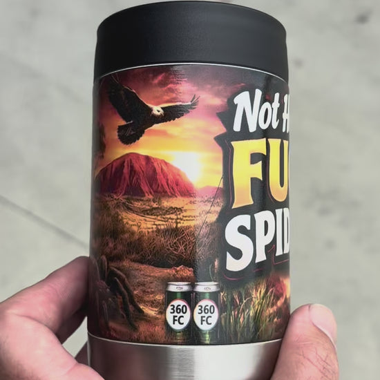 What's Included: One premium stainless steel stubby holder with professionally printed Not Here To Fuck Spiders image.